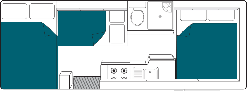 Schlafplätze: 3 Doppelbetten: 2,13 x 1,35 m im Alkoven, 1,85 x 1,23 m in der Mitte, 2,13 x 1,40 m im Heck