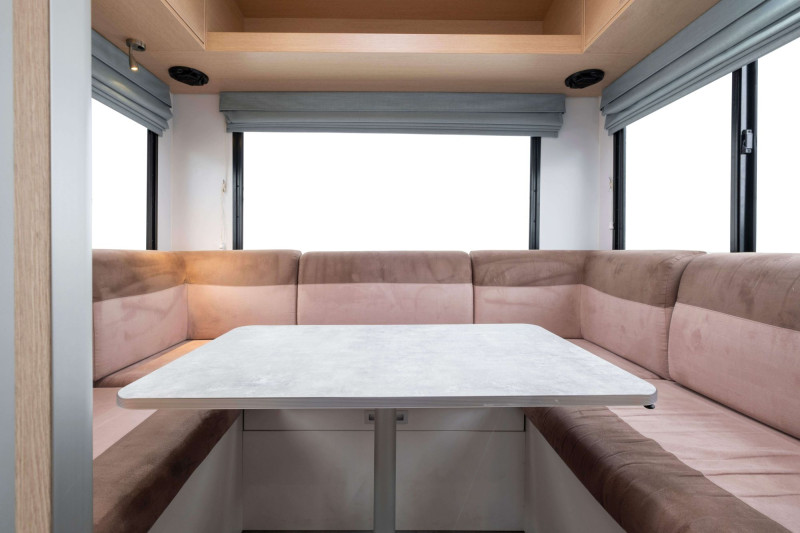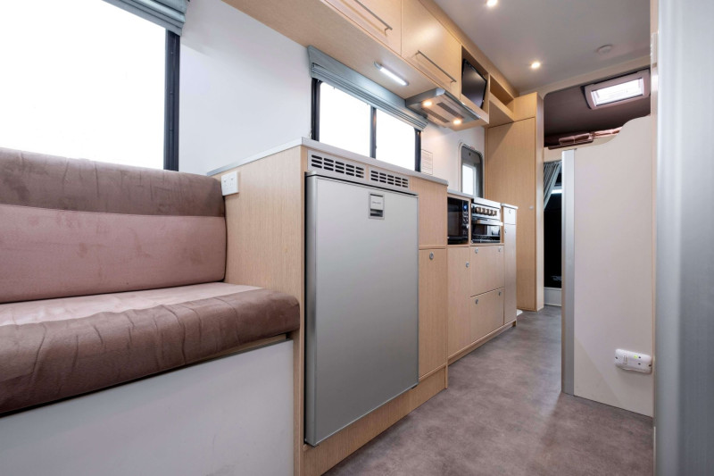 Ausstattung: Sitzplätze für 2 Personen in der Fahrerkabine, 2 im Wohnbereich, Kühlschrank mit Gefrierfach (148 - 188 l), Gasherd mit Gasflasche, Mikrowelle, ausziehbarer Außengrill, Spüle, Dusche/WC, Frischwassertank (90 l), Abwassertank (90 l), Trinkwasserfilter, Klimaanlage/Heizung im Fahrer- & Wohnbereich, Strom: 12 V/240 V, Solarenergie, Radio, Bluetooth, USB, Flachbildschirm/DVD Player, CD, GPS